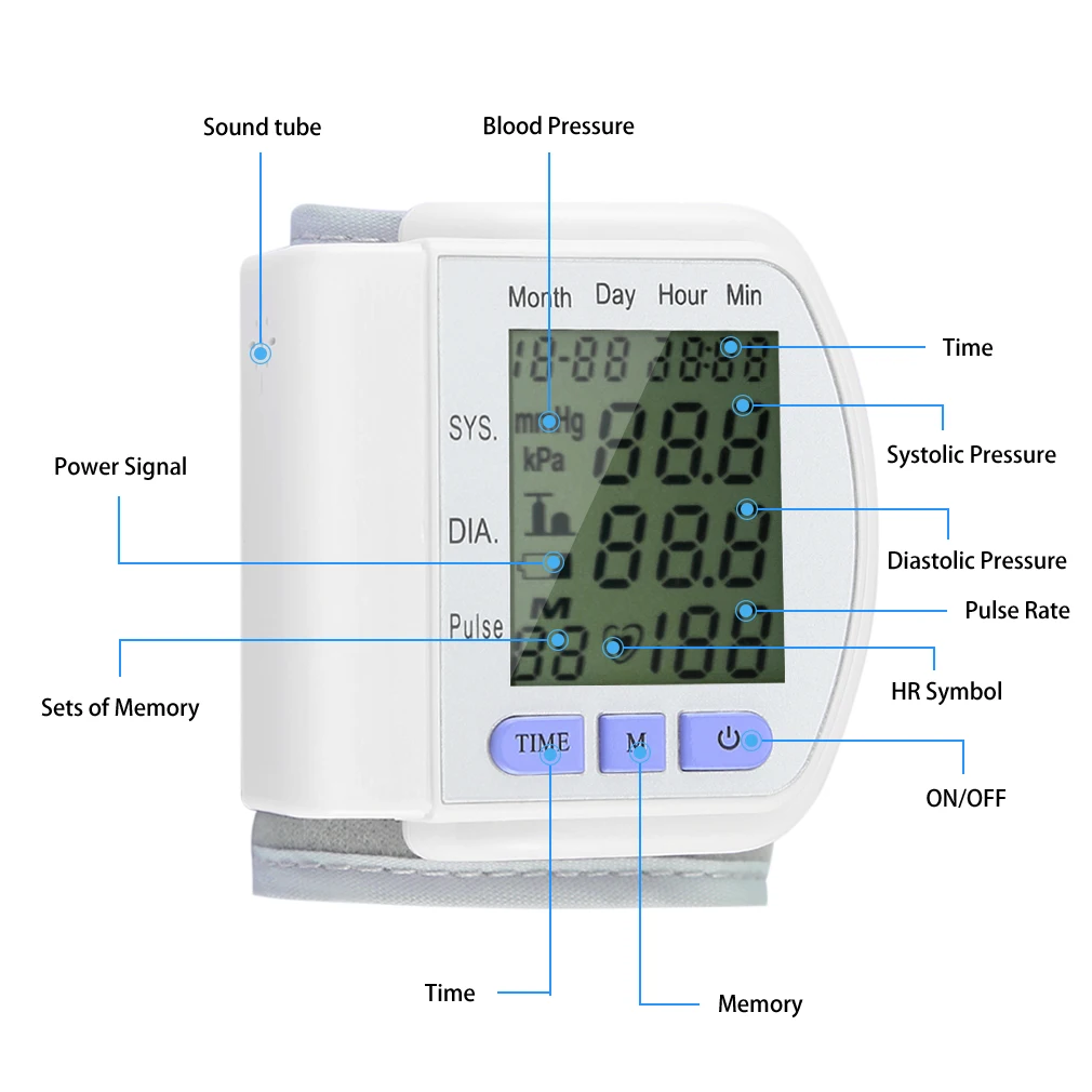 LCD displays Blood Pressure (Systolic and Diastolic), Pulse, Date, Time, Low Battery Icon, Heart Icon, Memory Record Number.